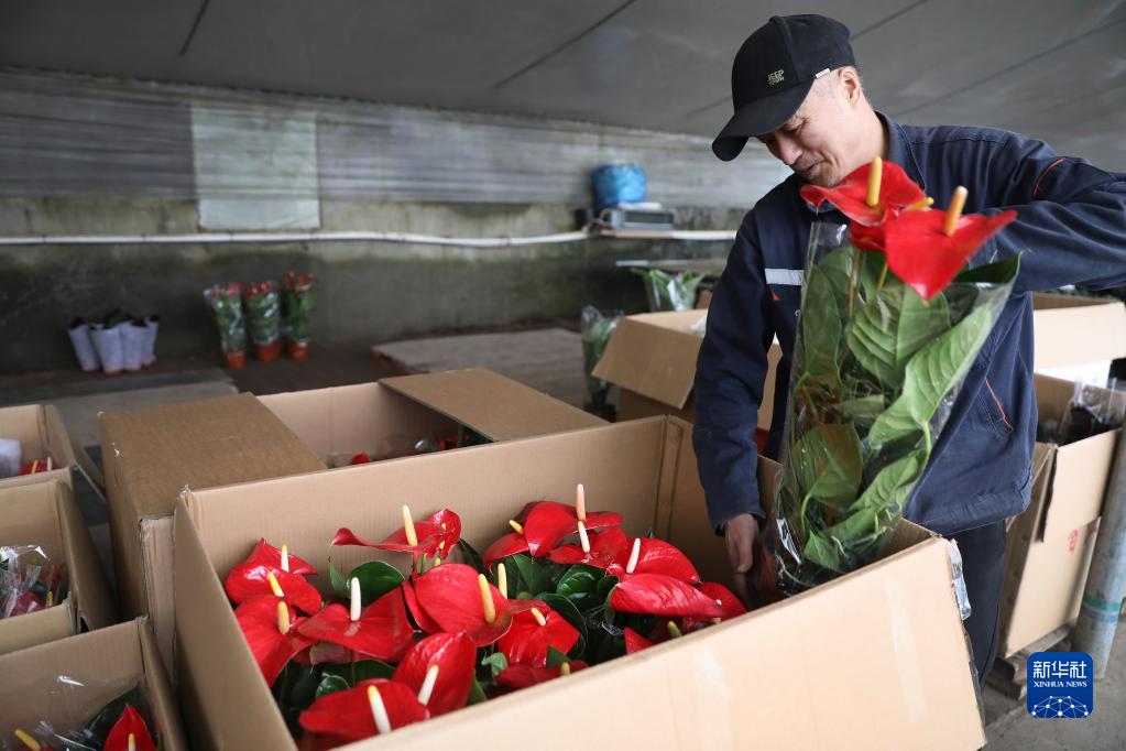 2月1日,沈陽(yáng)市十里河街道花卉基地一位花農將售出的花卉裝箱打包。