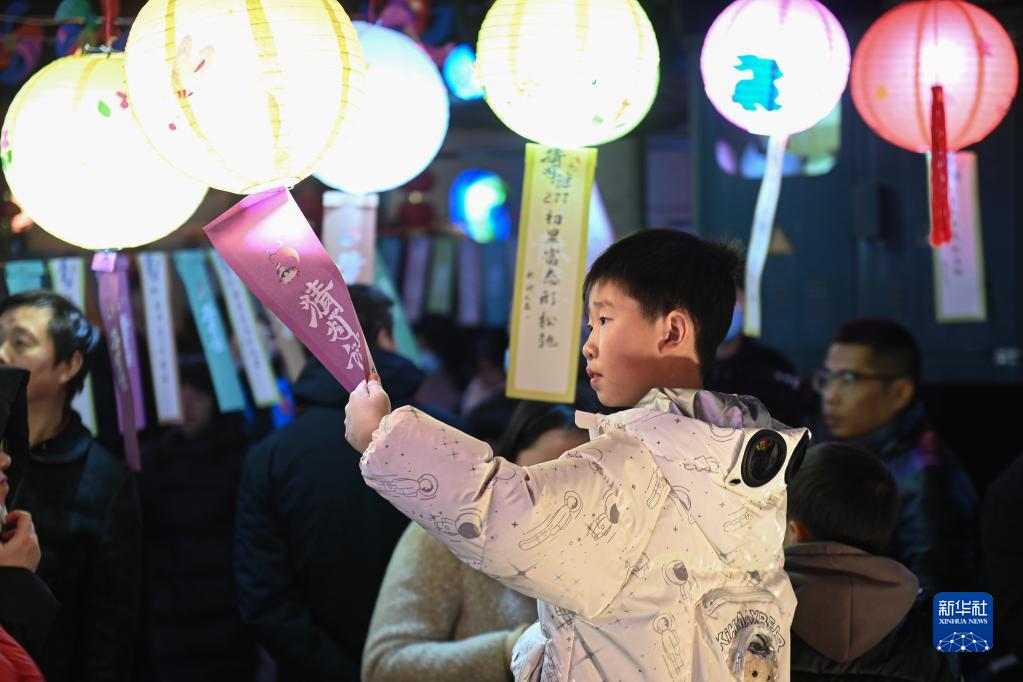2月2日,小朋友在浙江省湖州市南潯區菱湖鎮在古鎮景區猜燈謎。