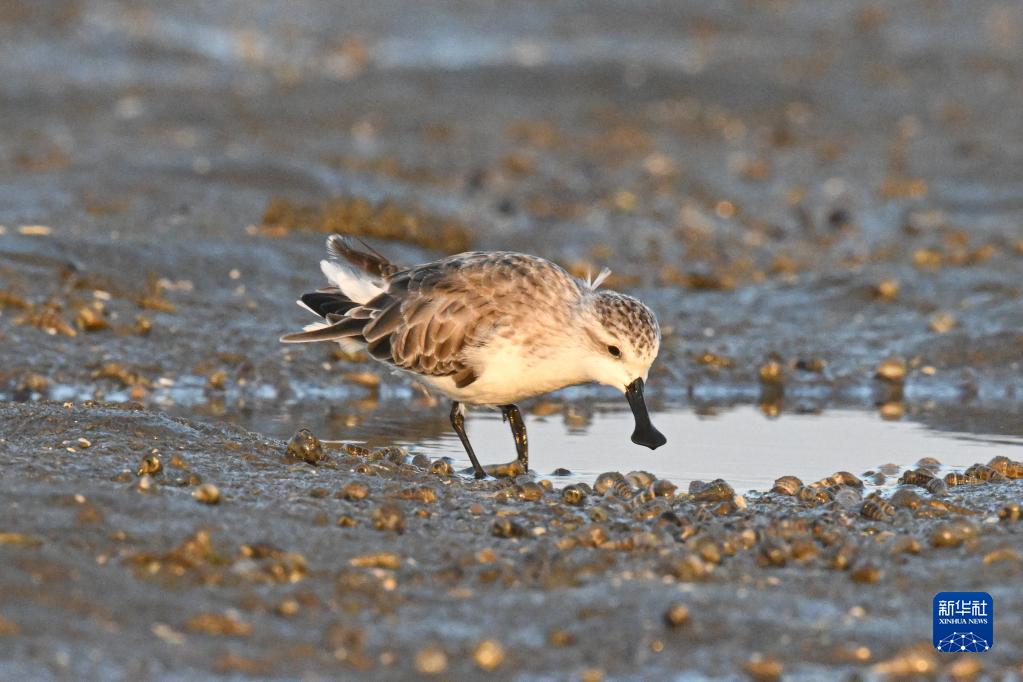 世界珍稀鳥(niǎo)類(lèi)勺嘴鷸在海南儋州灣濕地覓食(2022年12月11日攝)。
