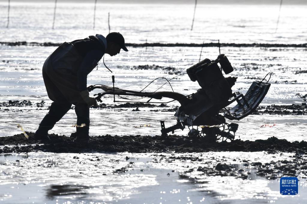 2月2日,福州瑯岐島漁民在翻耕灘涂播種蟶苗。