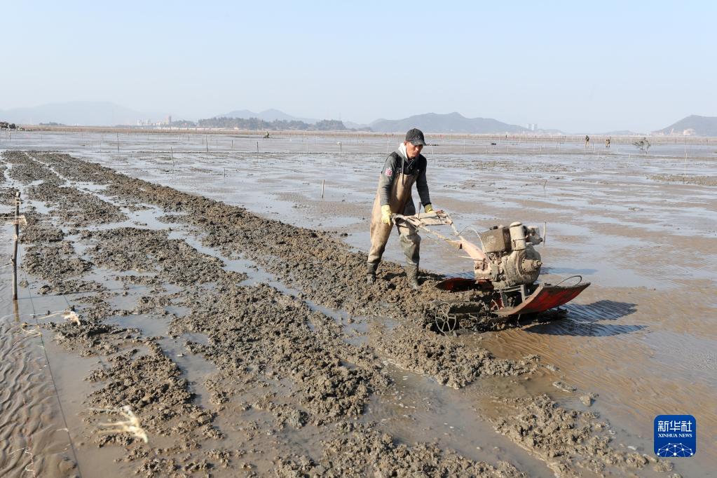 2月2日,福州瑯岐島漁民在翻耕灘涂播種蟶苗。