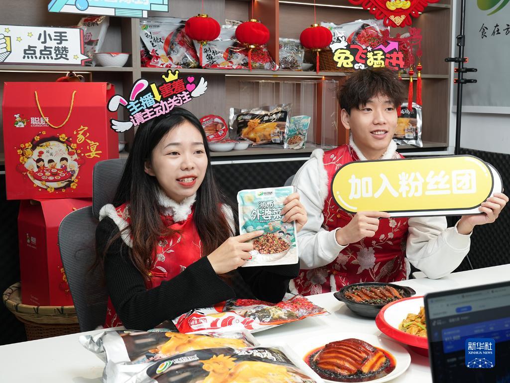 湖南網(wǎng)上年貨節期間,主播們在直播間向網(wǎng)友介紹特色菜品(1月12日攝)。新華社發(fā)