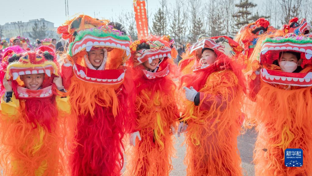 2月5日,小朋友在寧夏固原市隆德縣社火展演中進(jìn)行舞獅表演。