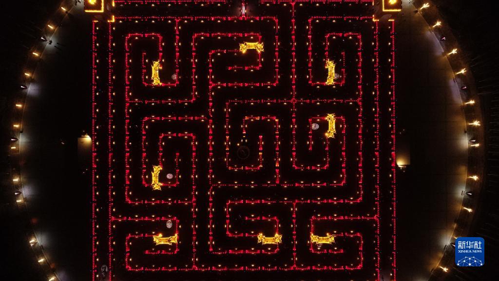 2月4日拍攝的寧夏鹽池縣黃河九曲龍門(mén)燈陣(無(wú)人機照片)。