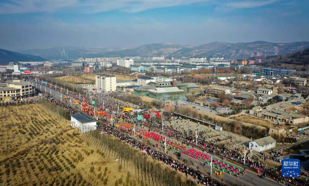 2月5日,寧夏固原市隆德縣在城區道路上舉行社火展演活動(dòng)(無(wú)人機照片)。