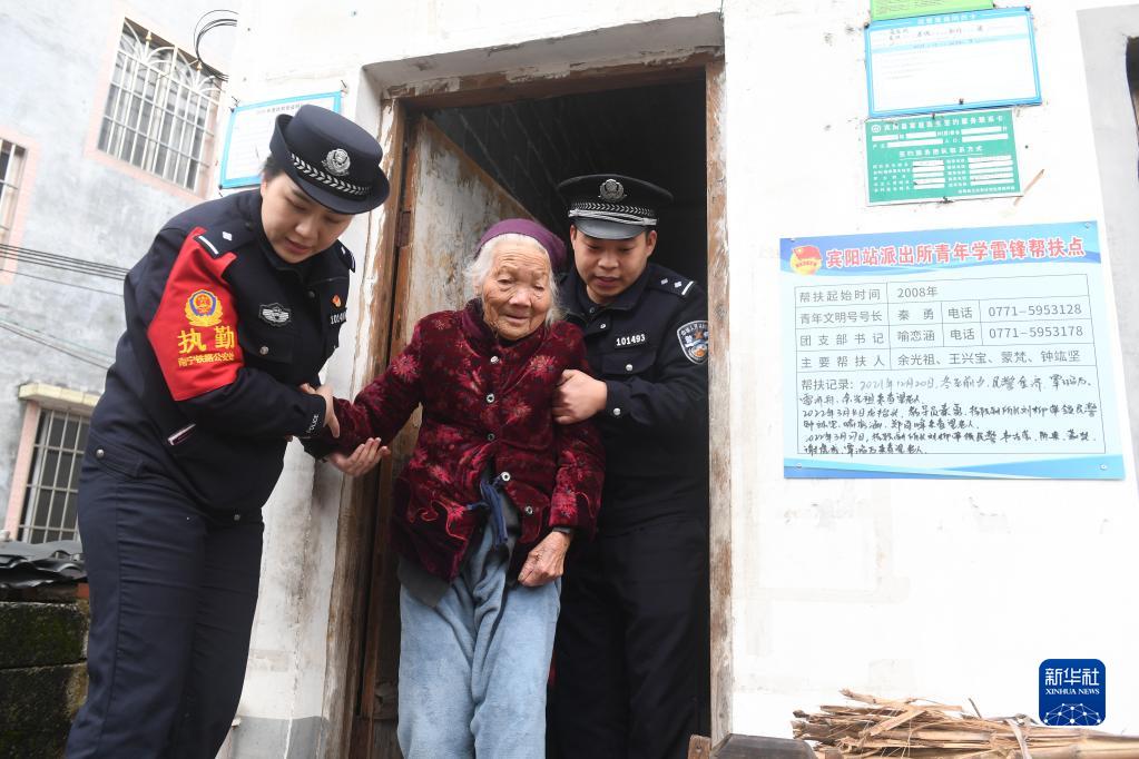 2月5日,在廣西賓陽(yáng)縣黎塘鎮梁村,賓陽(yáng)站派出所民警扶著(zhù)黃愛(ài)明老人走出家門(mén)。92歲的黃愛(ài)明老人,是當地一名五保戶(hù)老人。周末和節假日,派出所青年民警志愿者會(huì )帶著(zhù)一些生活用品去看望老人,陪她聊天,幫她做家務(wù)等,至今已經(jīng)14年。