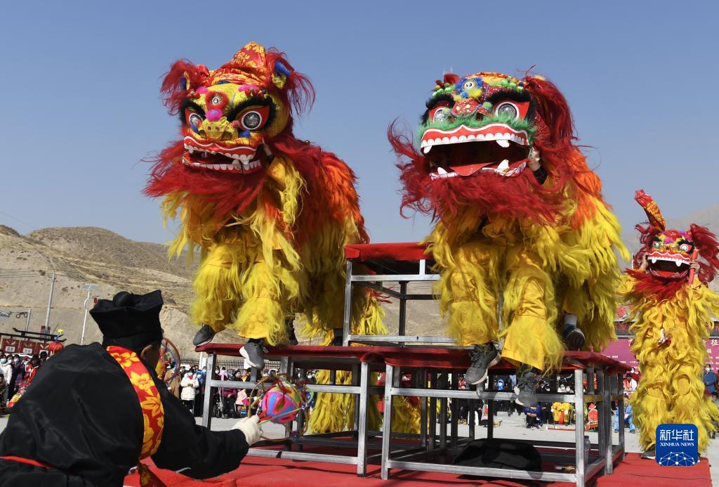2月5日,在甘肅省永靖縣劉家峽鎮城北新村,民間藝人在表演舞獅 。