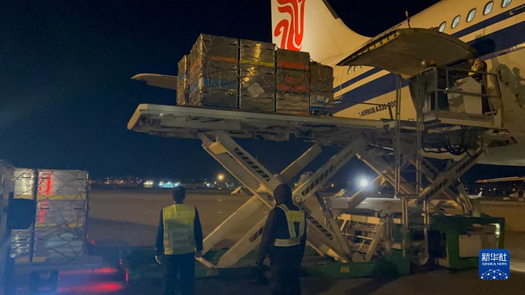 2月8日,工作人員在土耳其阿達納機場(chǎng)卸運中國救援隊攜帶的物資(手機拍攝)。