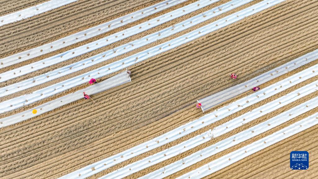 2月9日,農戶(hù)在四川省射洪市沱牌鎮龍泉村的地里蓋膜(無(wú)人機照片)。