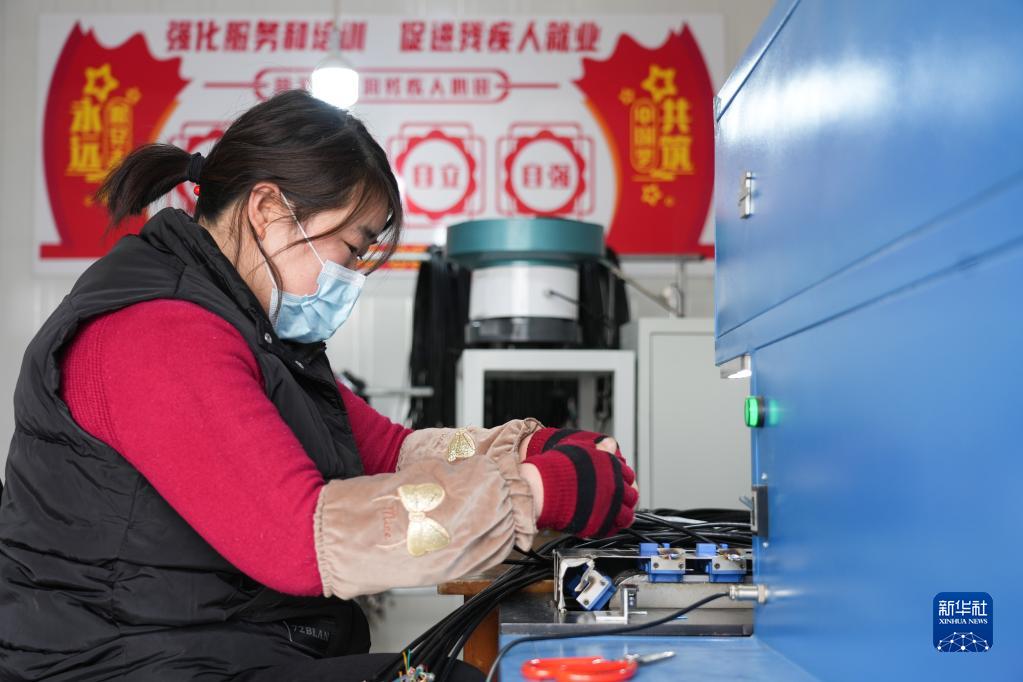 2月12日,在山東鄒城市太平鎮如康家園內,殘疾人在進(jìn)行電纜加工。