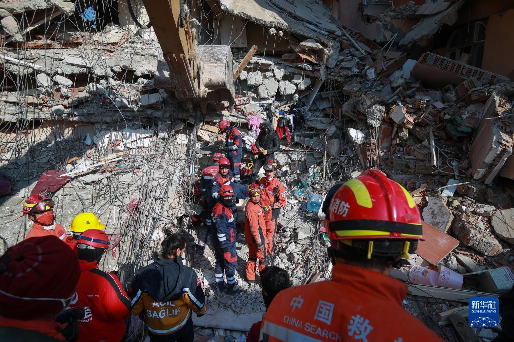 2月12日,在土耳其哈塔伊省安塔基亞市,中土兩國救援隊隊員在地震廢墟中搜救。
