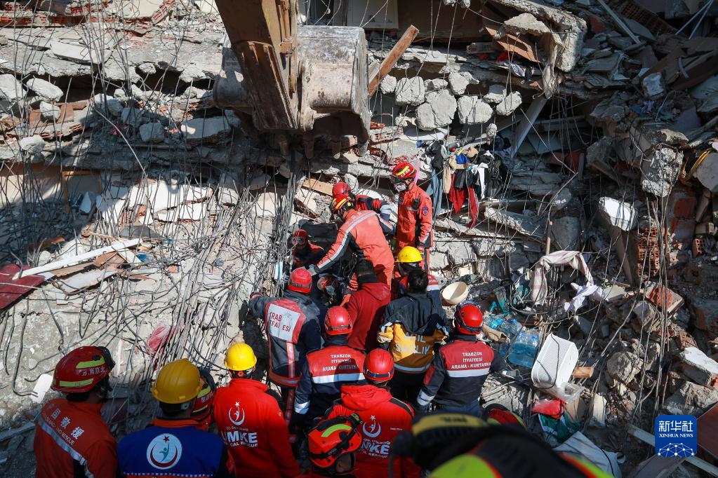2月12日,在土耳其哈塔伊省安塔基亞市,中土兩國救援隊隊員在地震廢墟中搜救。
