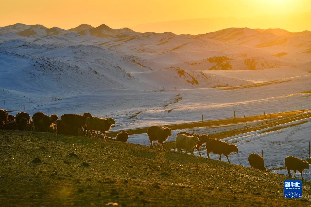 新疆裕民縣巴爾魯克山區,夕陽(yáng)映照牧場(chǎng),羊群歸來(lái)(2月11日攝)。