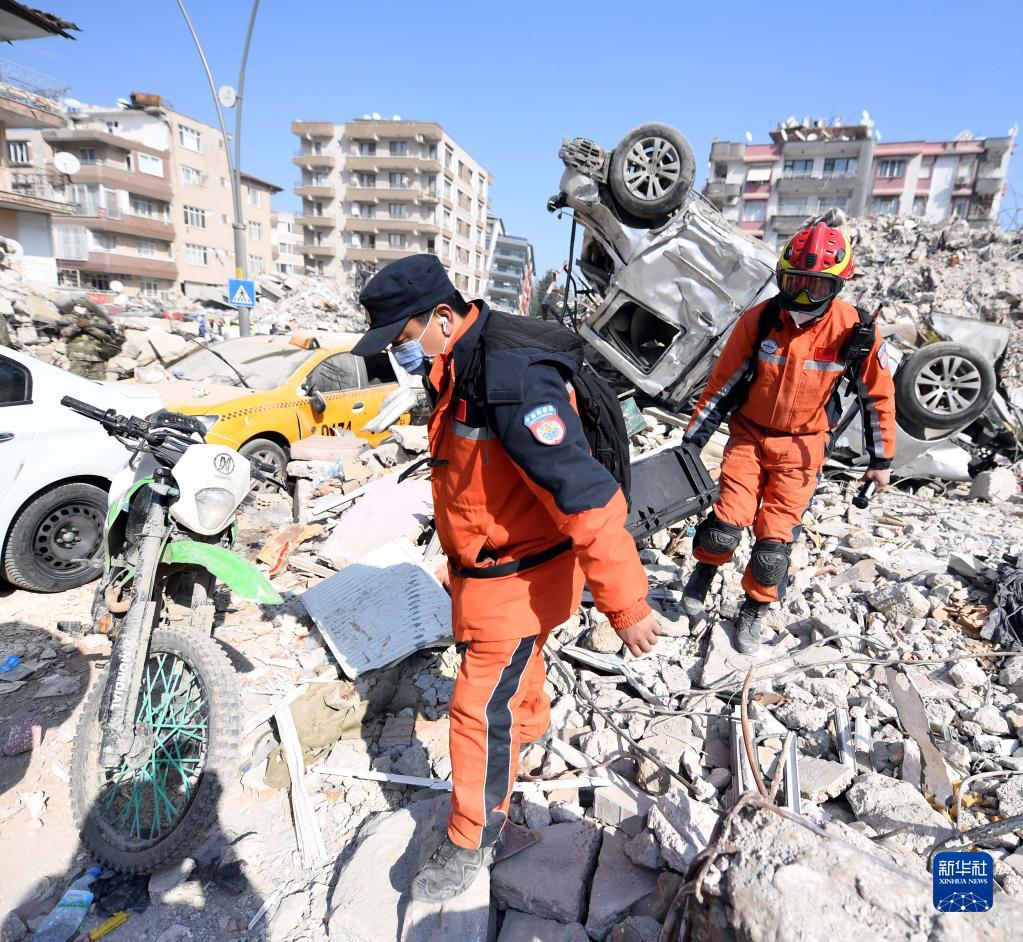 2月11日,中國救援隊隊員在土耳其哈塔伊省安塔基亞市一處地震廢墟開(kāi)展救援工作。