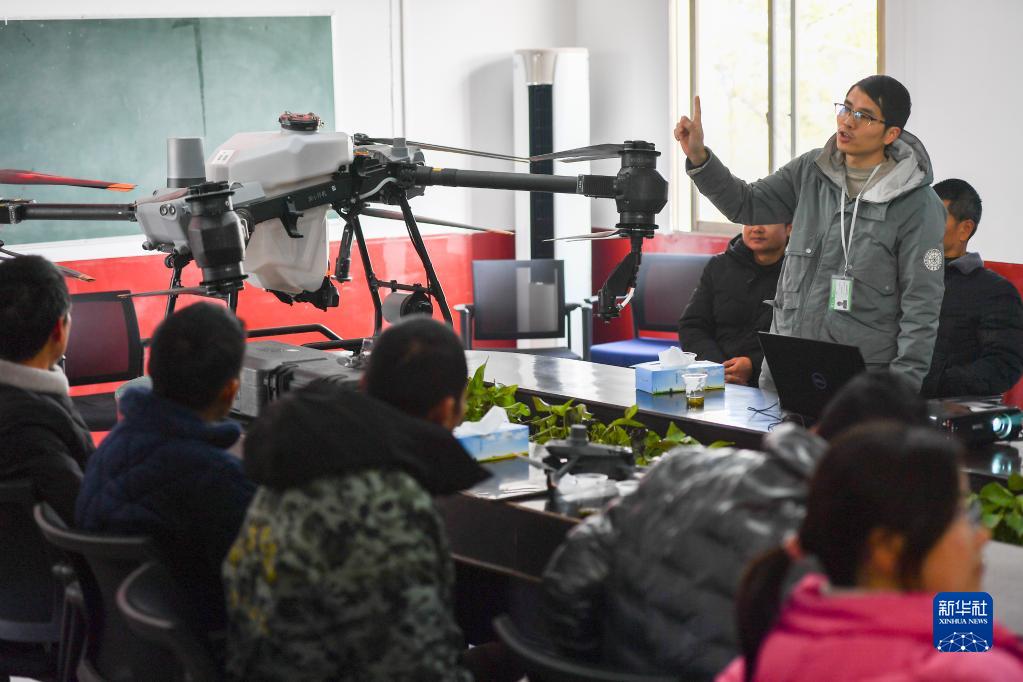 2月15日,在沅江市共華鎮福安村,老師在農業(yè)植保無(wú)人機操作員培訓班上講解無(wú)人機的構造。