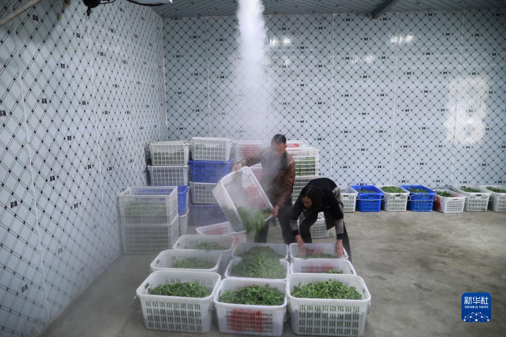 2月15日,在龍里縣灣灘河鎮,菜農在處理剛采摘的豌豆尖。