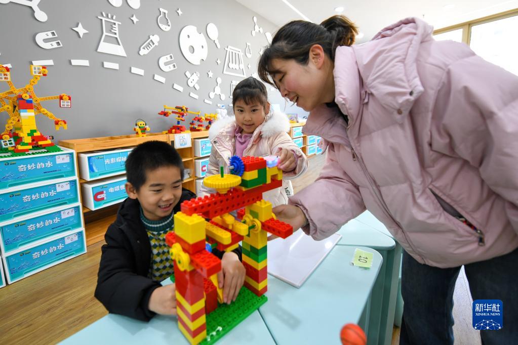 2月15日,在常州市新北區龍虎塘街道中心幼兒園(盤(pán)龍新區),小朋友們在老師的指導下拼搭積木。