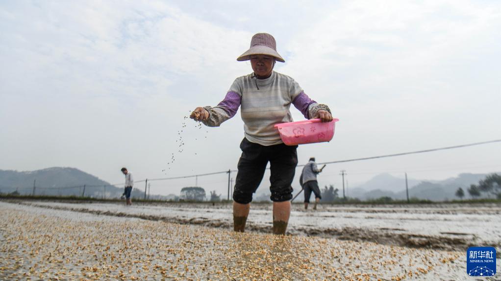 2月17日,廣西欽州市欽北區大寺鎮四聯(lián)村委那老村村民在播撒稻種育秧。