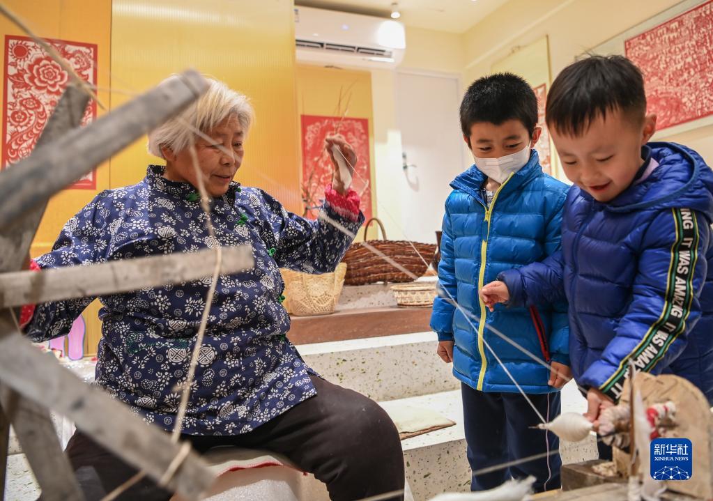 在榆林老街非遺大集的非遺展館內,非遺傳承人王秀芳(左)展示紡線(xiàn)織布技藝(2月17日攝)。