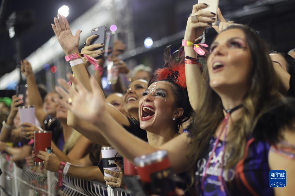 2月17日晚,人們在巴西圣保羅市阿年比桑巴大道觀(guān)看狂歡節表演。