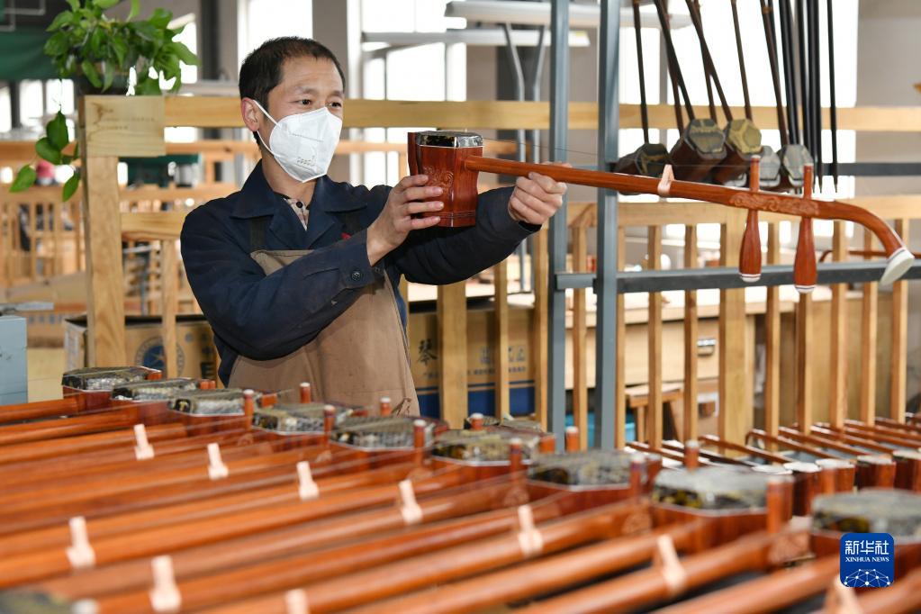 2月18日,河北省肅寧縣一家民族樂(lè )器生產(chǎn)企業(yè)的工人在生產(chǎn)車(chē)間內檢查二胡質(zhì)量。