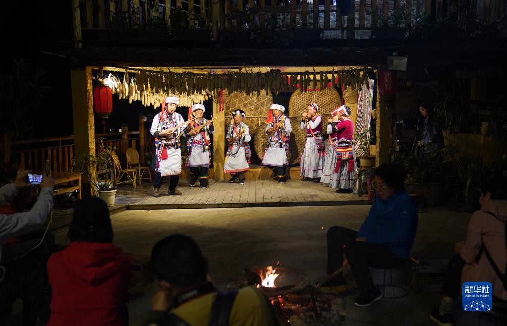 2月19日,游客在福貢縣匹河怒族鄉老姆登村一家客棧欣賞怒族舞蹈。