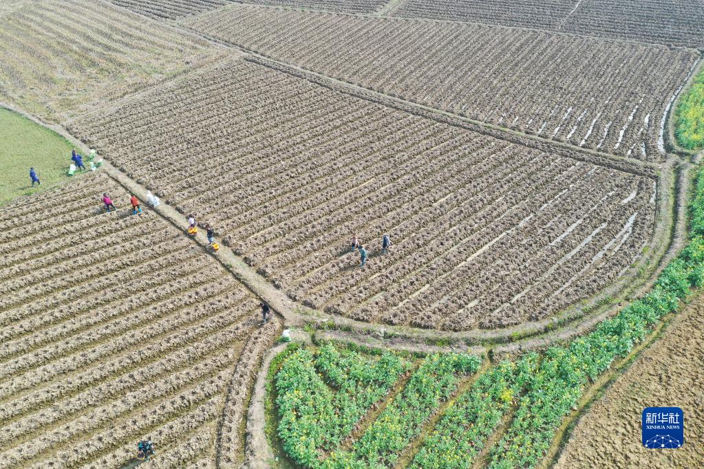 2月20日,湖南省永州市道縣祥霖鋪鎮銀山村村民在地里施底肥(無(wú)人機照片)。