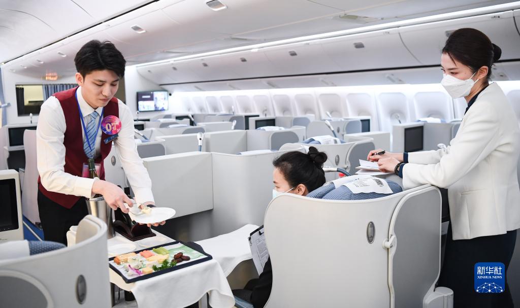 2月20日,參賽乘務(wù)員在中國南航廣州產(chǎn)教融合實(shí)訓基地的客艙模擬器中參加服務(wù)實(shí)操考核。