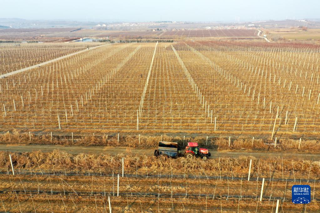 2月19日,在夏莊鎮甲夼區域鄉村振興共富黨建聯(lián)盟一處現代化蘋(píng)果產(chǎn)業(yè)基地內,村民在進(jìn)行果樹(shù)修枝、施肥作業(yè)(無(wú)人機照片)。