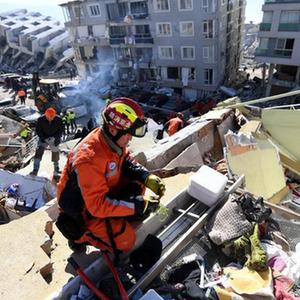 2月9日,中國救援隊在土耳其哈塔伊省安塔基亞市一處受損建筑物參與地震救援工作。