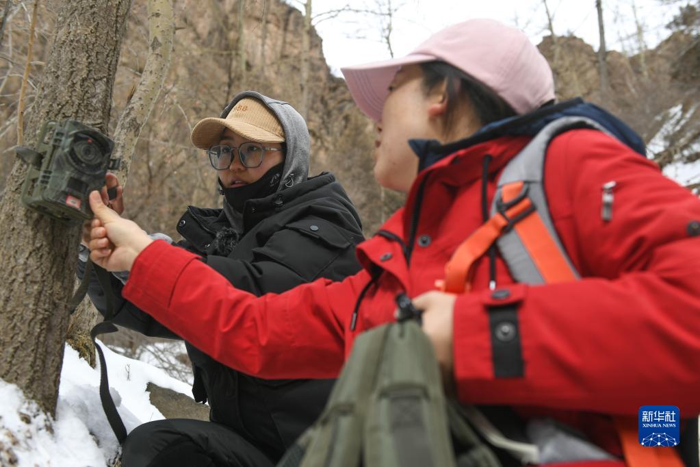 2月20日,在內蒙古賀蘭山國家級自然保護區,工作人員阿麗瑪(左)和徐皓在布設紅外相機。