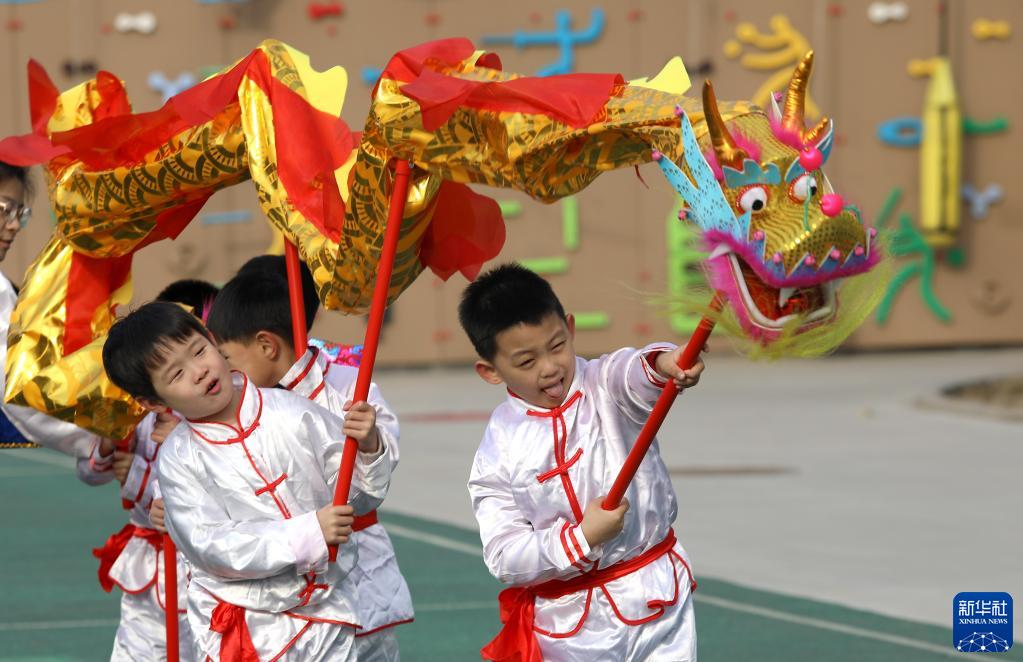 2月21日,在河北省石家莊市井陘礦區天護幼兒園,小朋友們在“二月二 龍抬頭”主題活動(dòng)中表演舞龍。