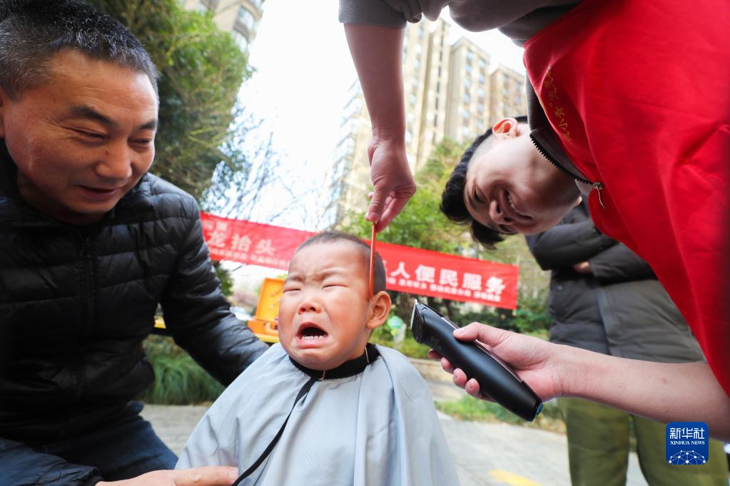 2月21日,理發(fā)師在浙江省湖州市德清縣武康街道英溪社區為小朋友免費理發(fā)。