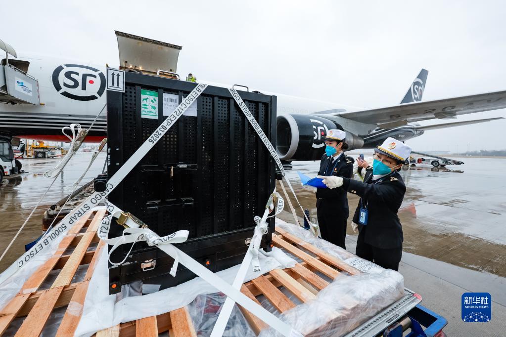 2月21日,在成都雙流國際機場(chǎng),海關(guān)工作人員在停機坪監卸大熊貓“香香”。