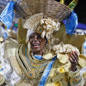 2月20日晚,在巴西里約熱內盧桑巴大道,桑巴舞校演員參加狂歡節游行。