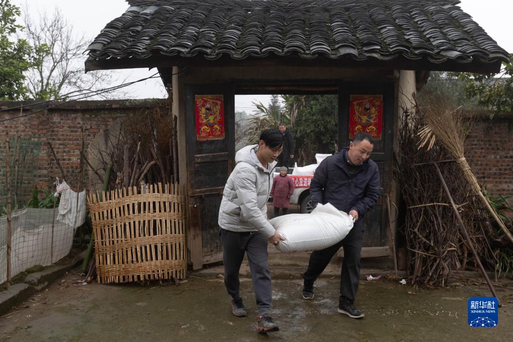 2月22日,四川省瀘縣供銷(xiāo)合作社農資服務(wù)員把化肥和種子送到云錦鎮稻子村秦治華家中。