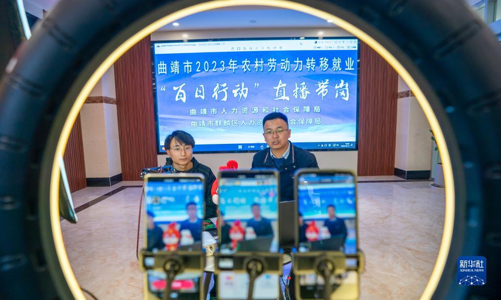 在云南省曲靖市麒麟區人力資源服務(wù)產(chǎn)業(yè)園,袁海波(右)通過(guò)網(wǎng)絡(luò )直播介紹就業(yè)崗位并宣傳就業(yè)服務(wù)政策(2月11日攝)。