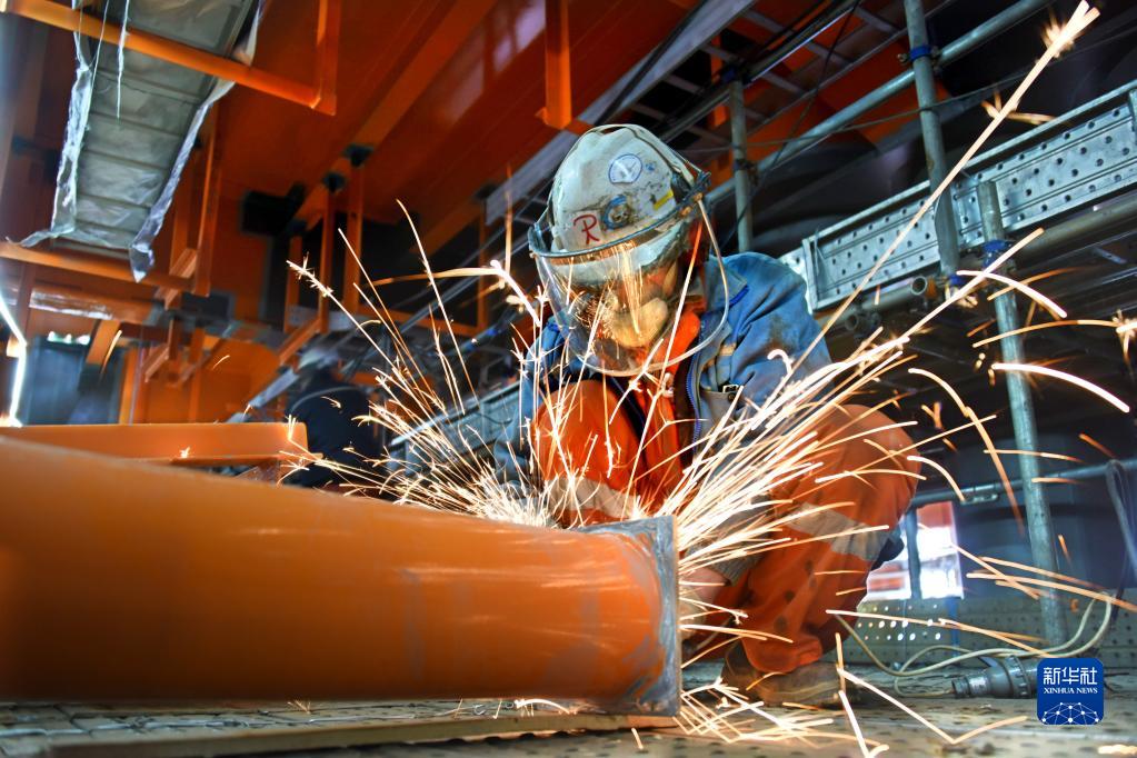 2月22日,工人在渤中19-6凝析氣田一期CEPA(中心處理平臺)組塊建造現場(chǎng)進(jìn)行打磨作業(yè)。