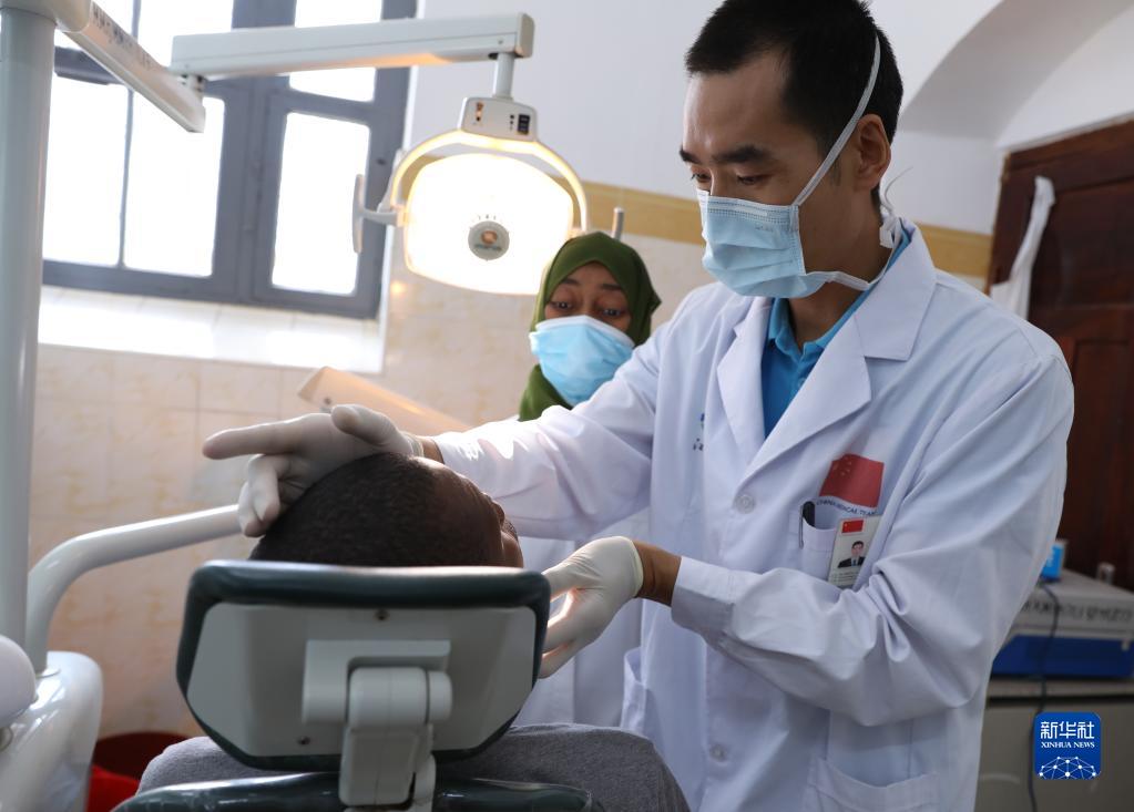 2月22日,在坦桑尼亞桑給巴爾島納茲莫加醫院,口腔科醫生盛磊給病人看病。