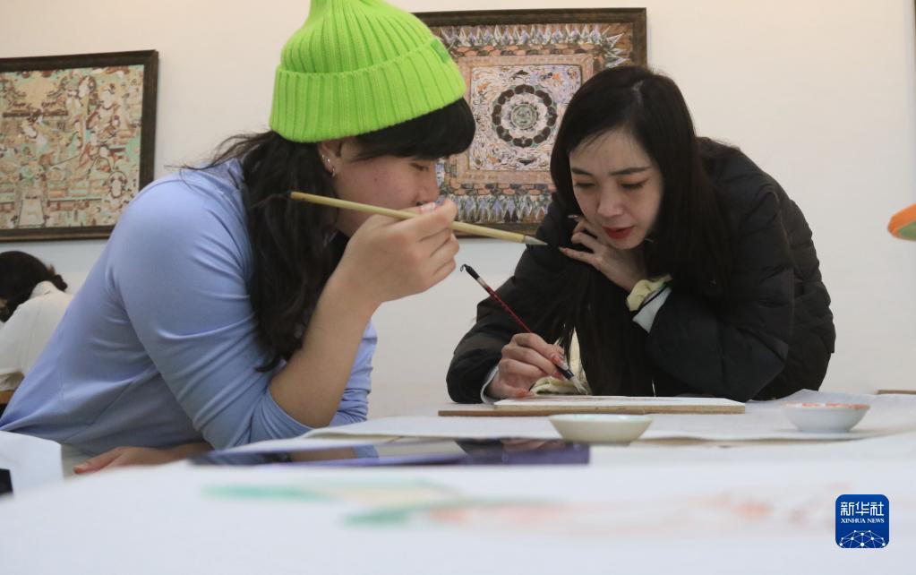 2月23日,在敦煌研究院莫高學(xué)堂,研學(xué)導師(右)指導學(xué)員臨摹敦煌壁畫(huà)。