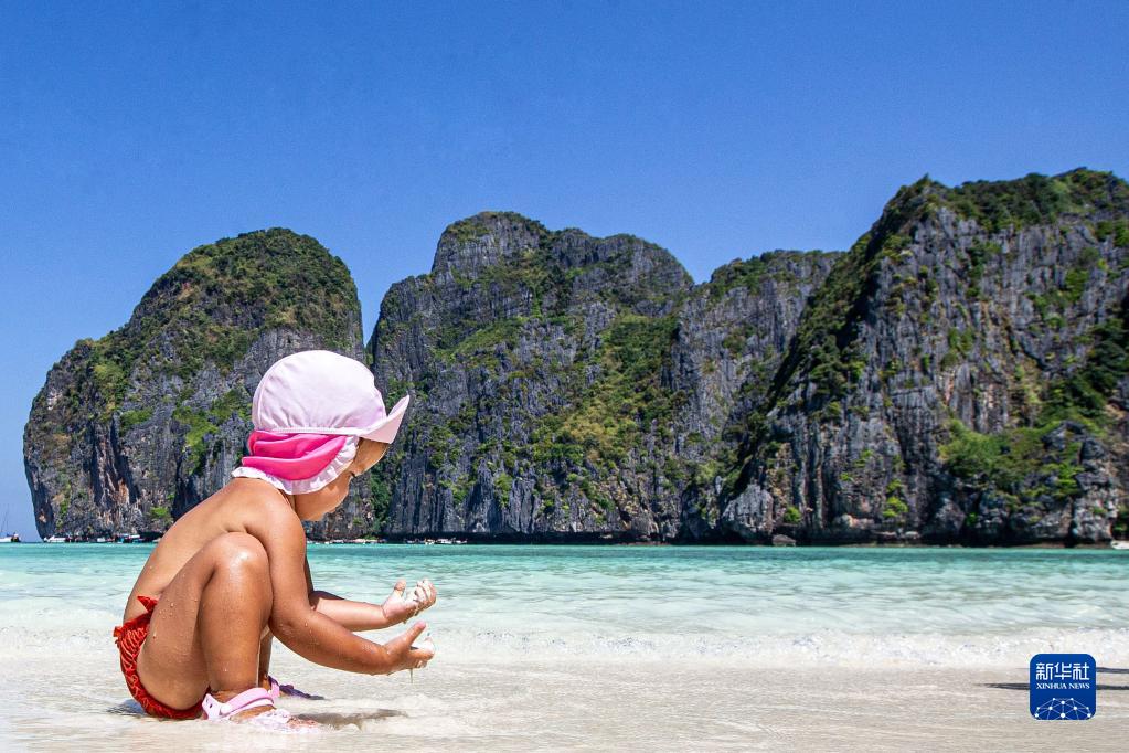 2月16日,小朋友在泰國皮皮島國家公園玩耍。