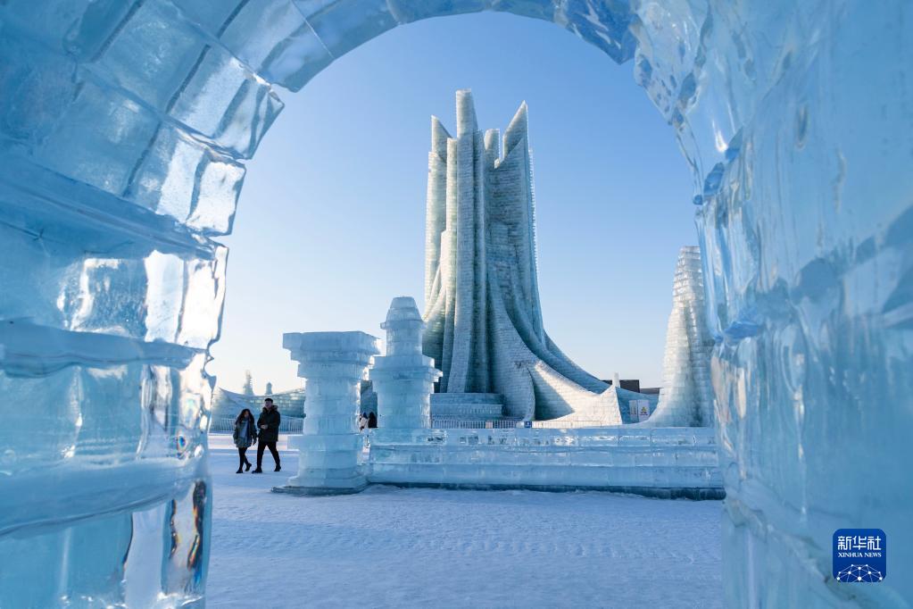 2月25日,游客在哈爾濱冰雪大世界園區游玩。
