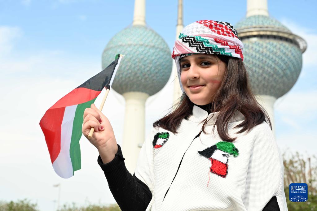 2月25日,一名女孩在科威特首都省參加慶?;顒?dòng)。