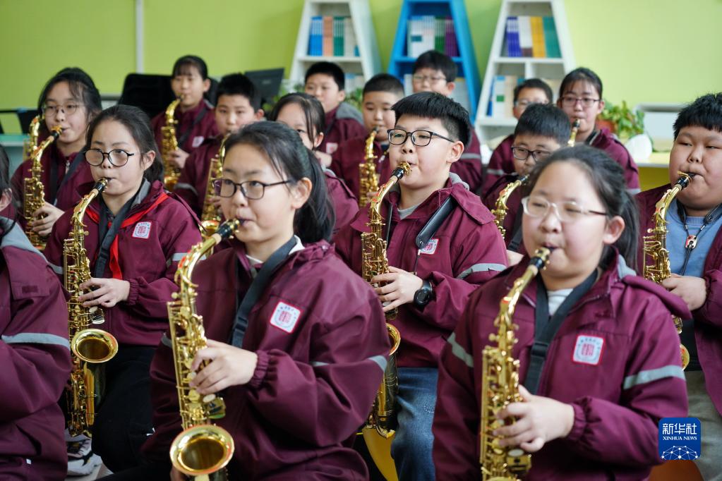 河北省武強縣府興小學(xué)的學(xué)生在練習吹奏薩克斯(2月23日攝)。武強縣常年開(kāi)展樂(lè )器進(jìn)校園活動(dòng)。
