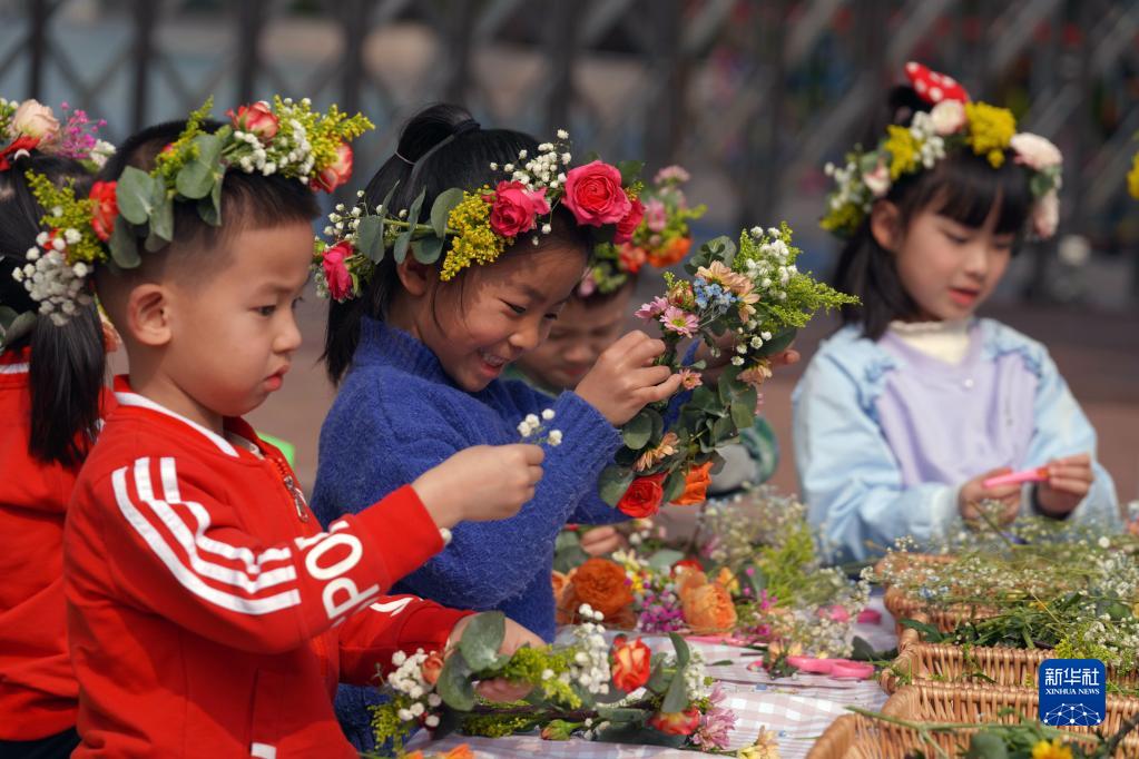 2月27日,重慶市北碚區縉云幼兒園的孩子們在編制花環(huán)。