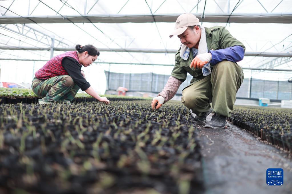 2月28日,當地農民在大棚內對羅漢果苗進(jìn)行管理。