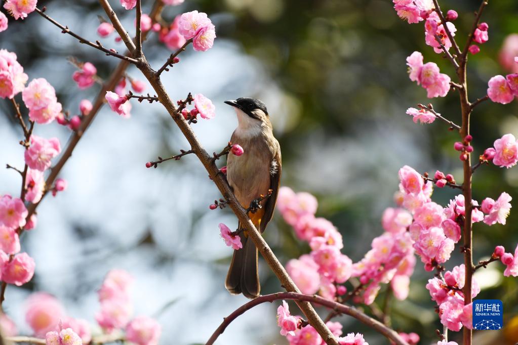 2月27日,小鳥(niǎo)在貴州省仁懷市街邊的梅花枝頭停歇。