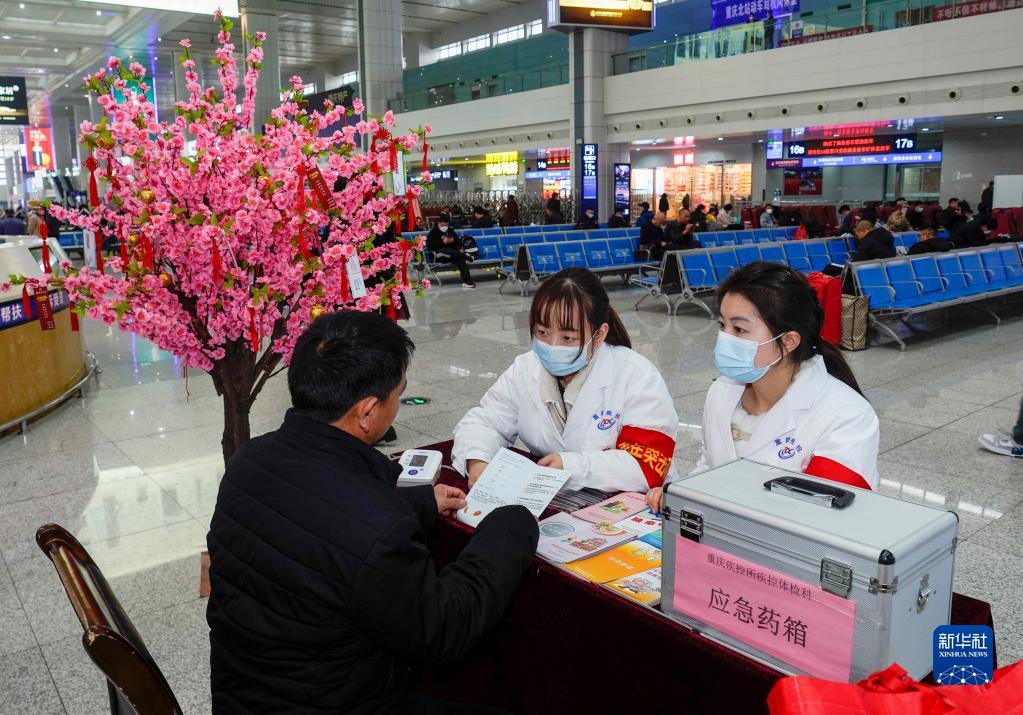 3月1日,在重慶北站北廣場(chǎng)(重慶火車(chē)站下轄車(chē)站)候車(chē)室內,“學(xué)雷鋒志愿服務(wù)隊”成員在為旅客提供義診服務(wù)。