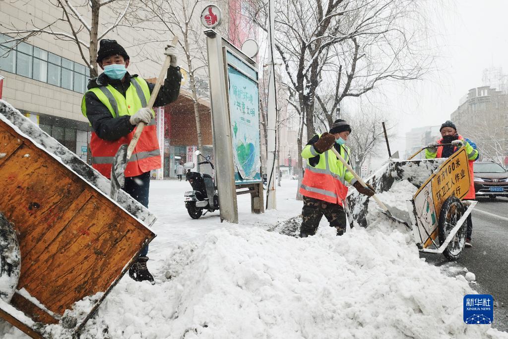 3月1日,在哈爾濱市香坊區一路段,環(huán)衛工人在清雪(無(wú)人機照片)。