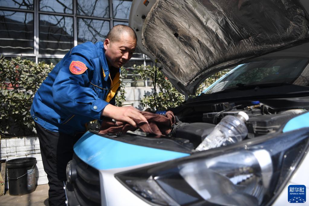 強漢紅在檢查、擦拭車(chē)輛(3月1日攝)。
